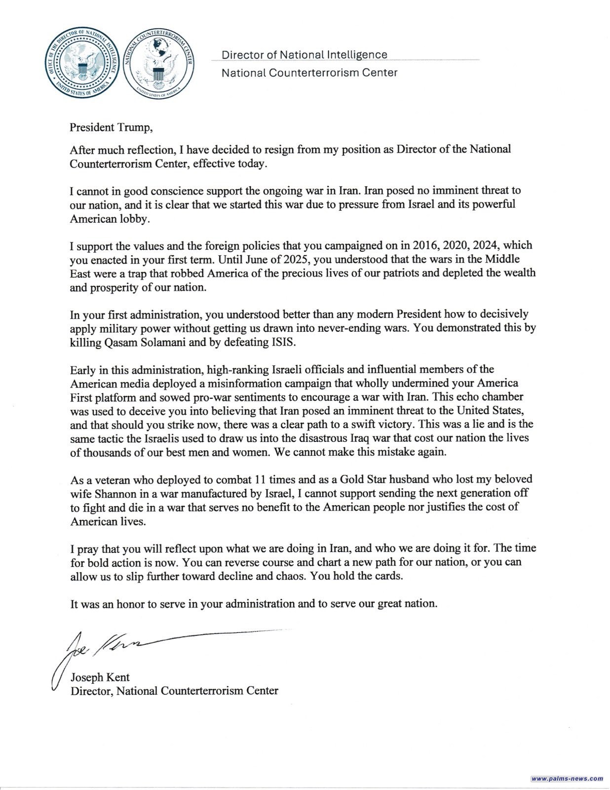 استقالة جو كينت "مدير المركز الوطني لمكافحة الإرهاب" في الإدارة الأمريكية؛ احتجاجًا على الحرب ضد إيران.