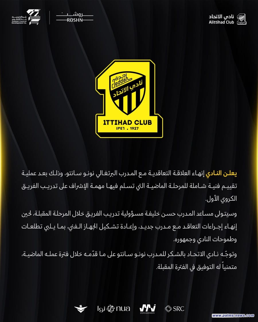 يذكر أن نونو، تولى قيادة نادي الاتحاد منذ تموز/يوليو 2022. وقاده إلى لقب الدوري الموسم الماضي، وقال النادي في بيان له على موقع (x) "يعلن النادي انهاء العلاقة التعاقدية مع المدرب البرتغالي نونو سانتو"