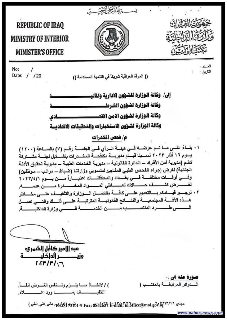 وجاء هذا بحسب وثيقة صادرة من مكتب وزير الداخلية ، انه "بناءً على ما تم عرضه في هيئة الرأي في الجلسة رقم (7) بالساعة (1200)، نسبنا قياد مديرية مكافحة المخدرات بتشكيل لجنة مشتركة لغرض إجراء الفحص الطبي المفاجئ لمنسوبي وزارتنا ( ضباط – مراتب – موظفين) وفي أوقات مختلفة في بغداد والمحافظات".