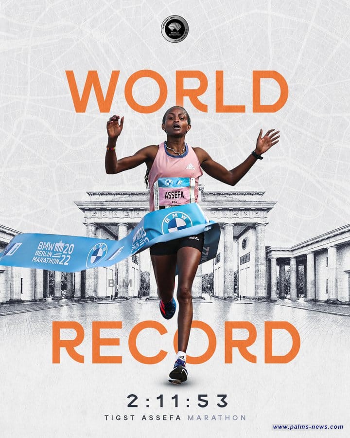 حطمت العداءة الإثيوبية تيغيست أسيفا اليوم الأحد الرابع والعشرين من أيلول الرقم القياسي العالمي لسباق الماراثون (42.195 كلم) بتسجيلها زمناً قدره (2.11.53) في برلين أي أقل من دقيقتين من الرقم القياسي السابق.