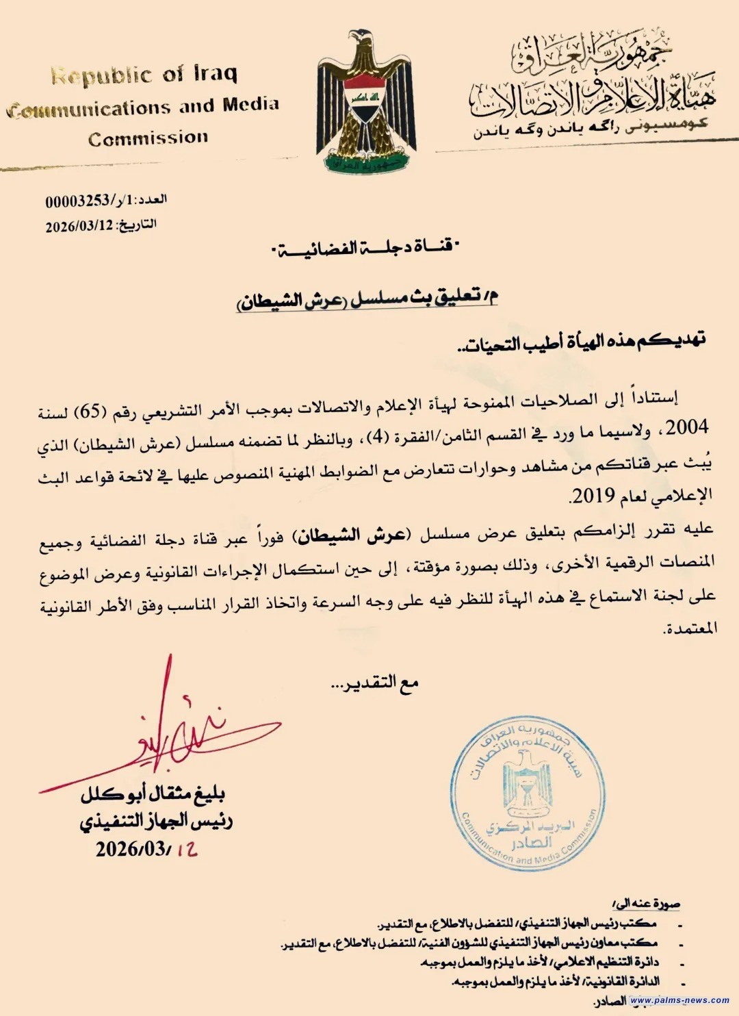 وبحسب وثيقة رسمية صادرة عن الهيئة، تقرر تعليق عرض المسلسل فوراً على قناة دجلة الفضائية وجميع المنصات الرقمية التابعة لها.