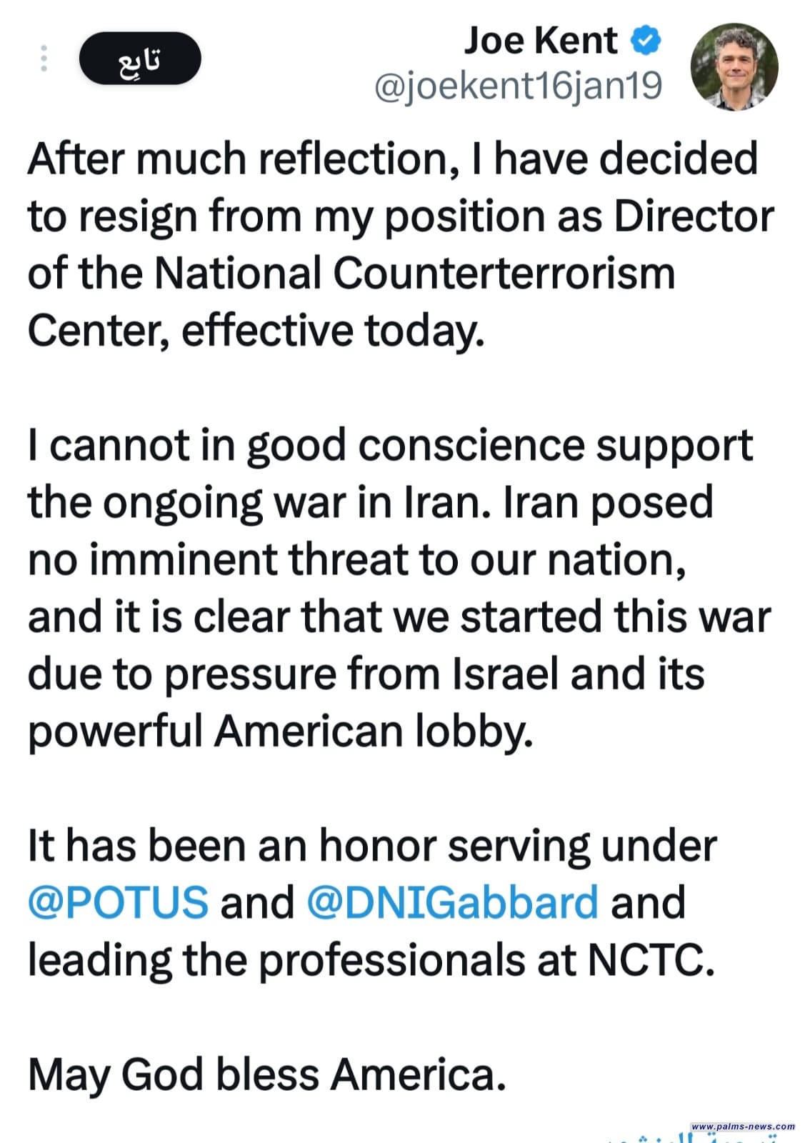 استقالة جو كينت "مدير المركز الوطني لمكافحة الإرهاب" في الإدارة الأمريكية؛ احتجاجًا على الحرب ضد إيران.