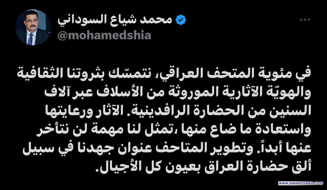 وقال السوداني في تغريدة على تويتر : "في مئوية المتحف العراقي، نتمسّك بثروتنا الثقافية والهويّة الآثارية الموروثة من الأسلاف عبر آلاف السنين من الحضارة الرافدينية".